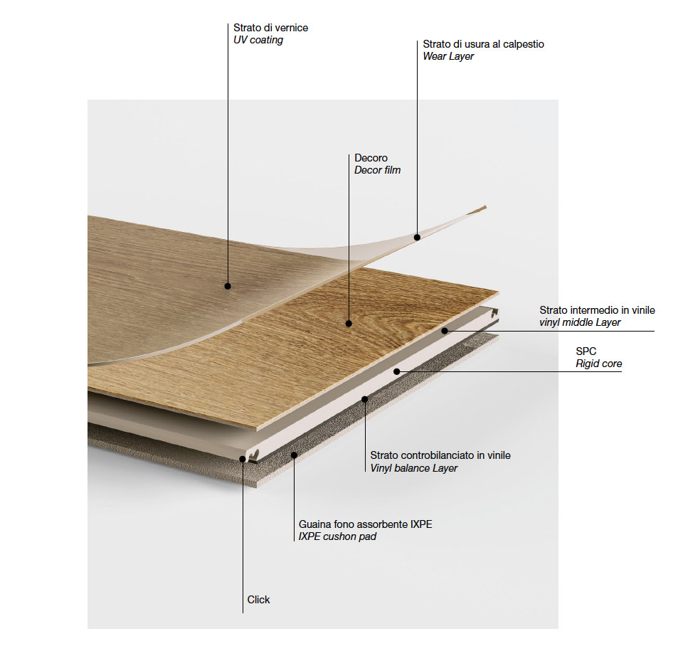Guardare le cose secondo un’altra prospettiva ci consente di trovare soluzioni innovative: Quickly ESPC è l’esempio perfetto di come la multi-materialità possa diventare un plus vantaggioso. Gli ESPC, acronimo di Engineered Stone Polymer Composite, rappresentano una rivoluzione nel mondo della pavimentazione. Questi pavimenti sono il risultato di una fusione di materiali avanzati, che li rende un’opzione pratica e versatile. Con alcuni accorgimenti, è possibile posare Quickly ESPC su quasi tutti i sottofondi esistenti. Lo spessore di 5.5mm permette di poterlo sovrapporre ai pavimenti già esistenti senza alzarsi di quota. Il pratico incastro a click 5G e il materassino XPE incluso, solidale alla struttura, permettono il montaggio veloce e senza utilizzo di collanti. Con Quickly si possono soddisfare le esigenze di pavimentazione di qualsiasi ambiente: casa, negozi, uffi ci, ma anche locali che devono sopportare un transito maggiore come centri commerciali, hotel o ristoranti. La particolare struttura rende Quickly idoneo alla posa su massetti riscaldanti. La gamma si articola in cinque diverse colorazioni, oppure a richiesta per quantitativi minimi di 300mq è possibile attingere ad un più ampio ventaglio di colori.